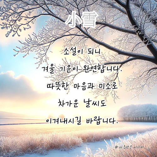 "오늘은 소설입니다. 겨울이 시작되며 첫눈 소식도 들려오는 시기죠. 따뜻한 차 한 잔으로 하루를 여유롭게 시작하시길 바랍니다." "소설을 맞이하며 겨울이 성큼 다가온 것 같아요. 추워진