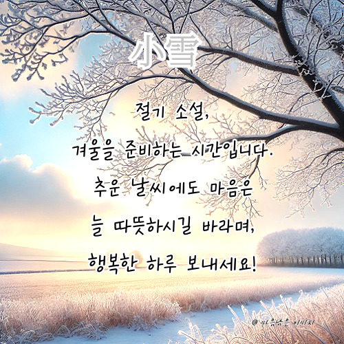 "소설은 '첫눈이 내리는 시기'를 뜻합니다. 추운 날씨에 옷 따뜻하게 입으시고 건강 챙기세요!" "오늘은 소설입니다. 겨울의 문턱에서 첫눈 소식이 들려오는 시기죠. 따뜻한 하루 보내세요!"
