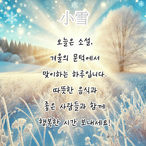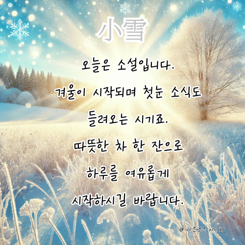 "오늘은 소설입니다. 겨울이 시작되며 첫눈 소식도 들려오는 시기죠. 따뜻한 차 한 잔으로 하루를 여유롭게 시작하시길 바랍니다." "소설을 맞이하며 겨울이 성큼 다가온 것 같아요. 추워진