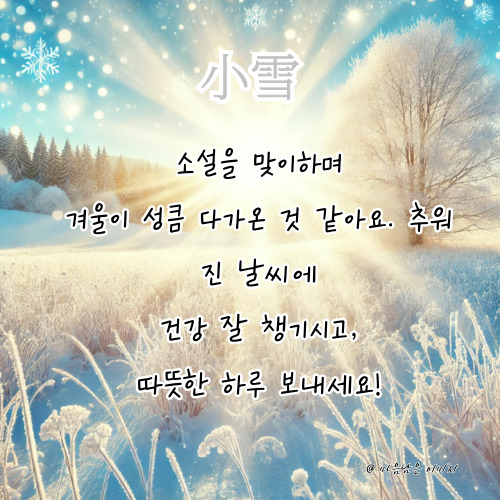 "소설은 '첫눈이 내리는 시기'를 뜻합니다. 추운 날씨에 옷 따뜻하게 입으시고 건강 챙기세요!" "오늘은 소설입니다. 겨울의 문턱에서 첫눈 소식이 들려오는 시기죠. 따뜻한 하루 보내세요!"