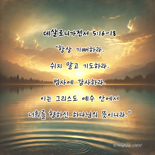 "항상 기뻐하라. 쉬지 말고 기도하라. 범사에 감사하라. 이는 그리스도 예수 안에서 너희를 향하신 하나님의 뜻이니라."