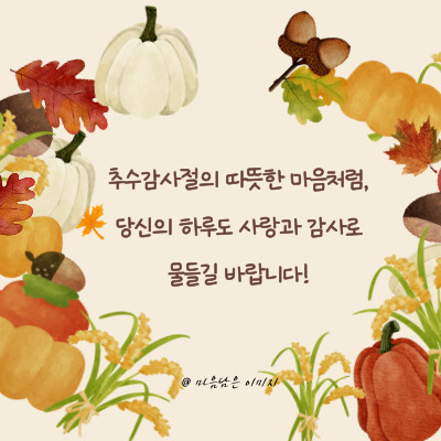 "추수감사절의 따뜻한 마음처럼, 당신의 하루도 사랑과 감사로 물들길 바랍니다!"