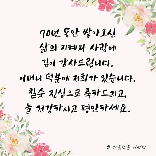 "70년 동안 쌓아오신 삶의 지혜와 사랑에 깊이 감사드립니다.